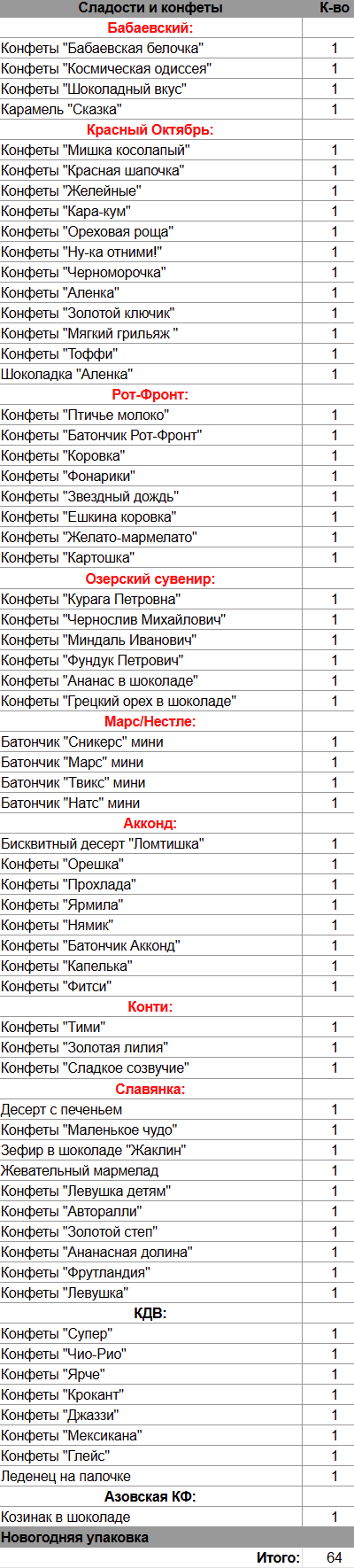 Кол-во сладостей: 64 шт.