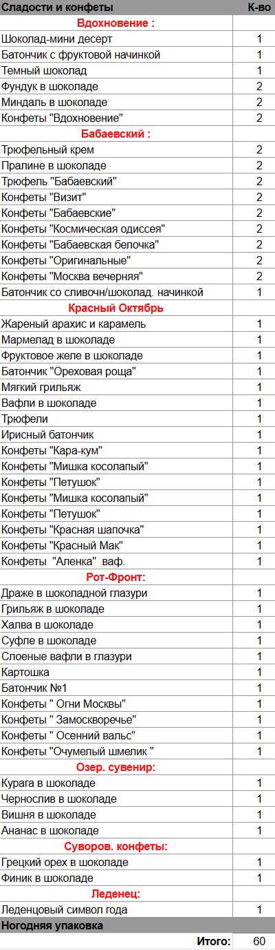 Шоколад-мини десерт (1 шт), Батончик с фруктовой начинкой (1 шт), Темный шоколад (1 шт), Фундук в шоколаде (2 шт), Миндаль в шоколаде (2 шт), Трюфельный крем (2 шт), Пралине в шоколаде (2 шт), Трюфель "Бабаевский" (2 шт), Батончик со сливочн/шоколад. начинкой (1 шт), Курага в шоколаде (1 шт), Чернослив в шоколаде (1 шт), Вишня в шоколаде (1 шт), Ананас в шоколаде (1 шт), Грецкий орех в шоколаде (1 шт), Финик в шоколаде (1 шт), Жареный арахис и карамель (1 шт), Мармелад в шоколаде (1 шт), Фруктовое желе в шоколаде (1 шт), Батончик "Ореховая роща" (1 шт), Мягкий грильяж (1 шт), Трюфели (1 шт), Ирисный батончик (1 шт), Вафли в шоколаде (1 шт), Драже в шоколадной глазури (1 шт), Грильяж в шоколаде (1 шт), Халва в шоколаде (1 шт), Суфле в шоколаде (1 шт), Слоеные вафли в глазури (1 шт), Картошка (1 шт), Батончик №1 (1 шт), Леденцовый символ года (1 шт)
